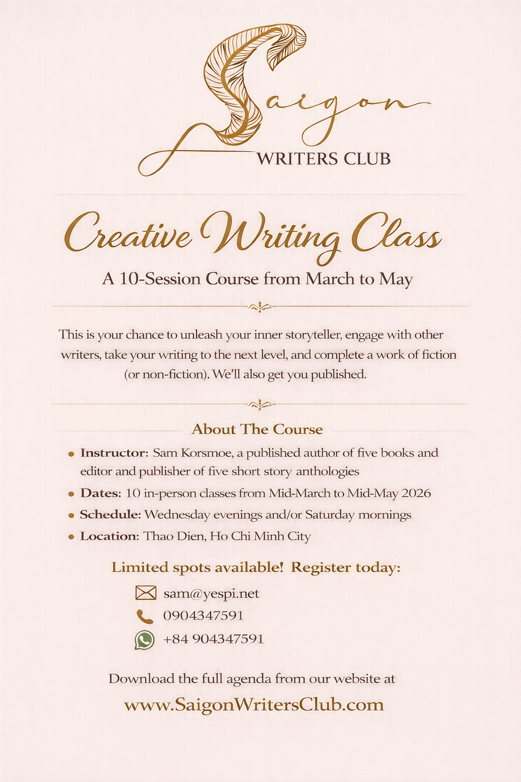 Sam Korsmoe is the founder and lead instructor for the Saigon Writers Club. He is an American writer who has published two books and is nearing publication of a third book on the future of Vietnam. He has taught creative writing to adults and youth and has accumulated 10,000 hours of writing practice.